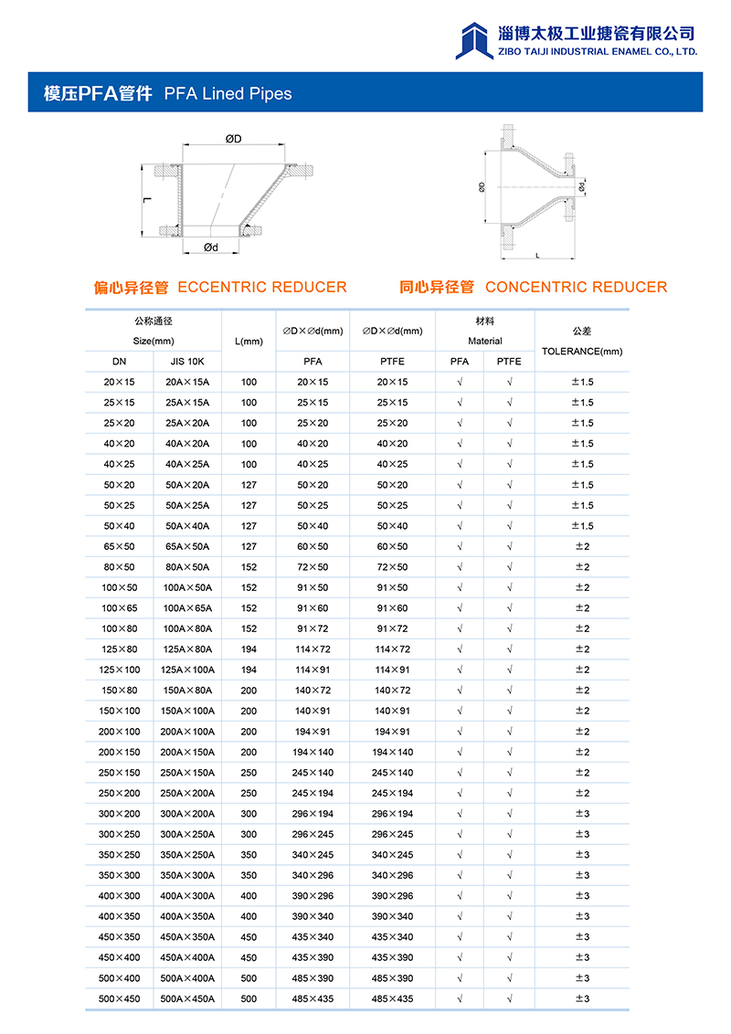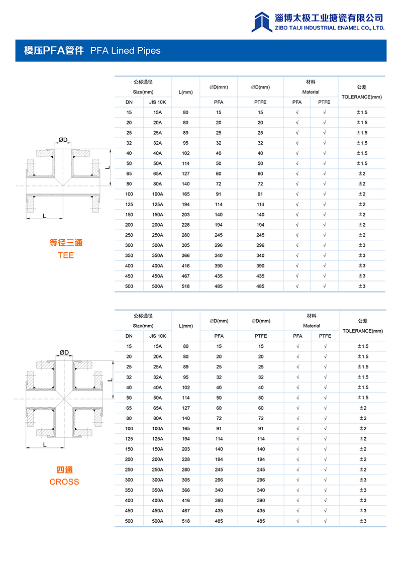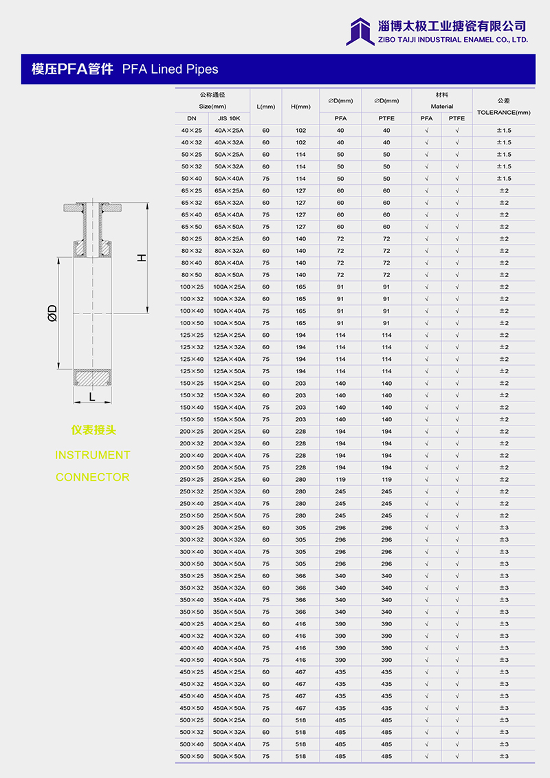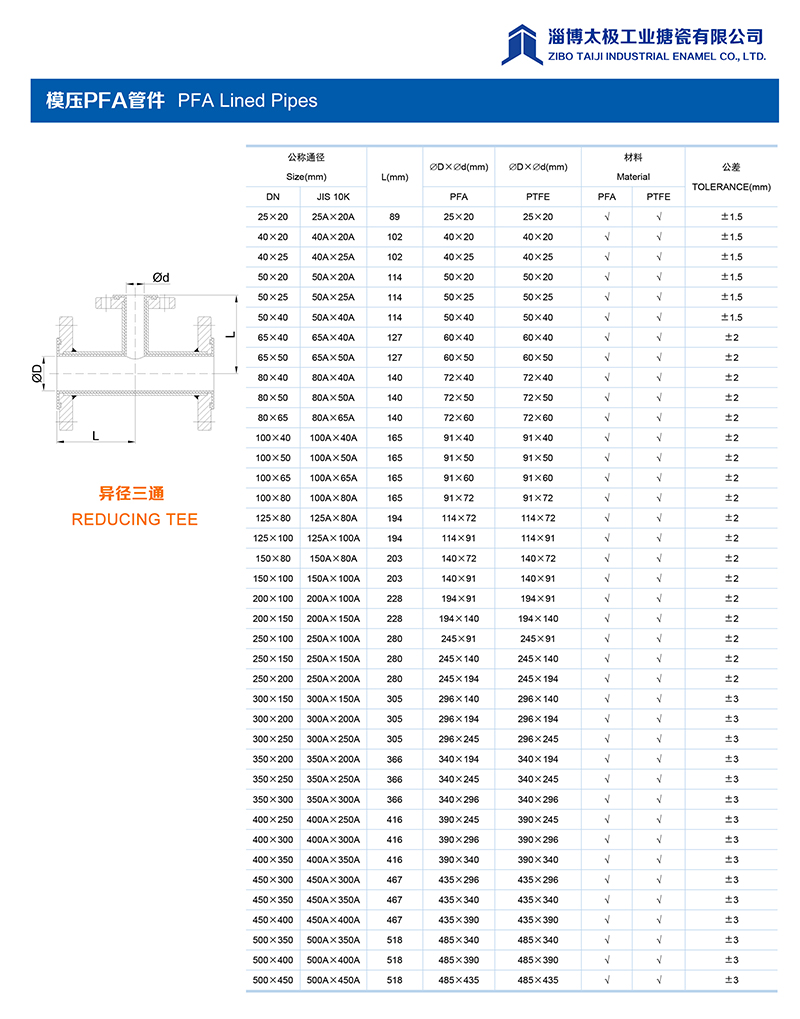 本公司的模壓PFA管件,采用耐強腐蝕的PFA材料,具有高密度、高強度和襯層厚度均勻等特點。每一個尺寸要求都精確控制,從模具加工精度到成型后的氟塑料加工精度都精益求精。